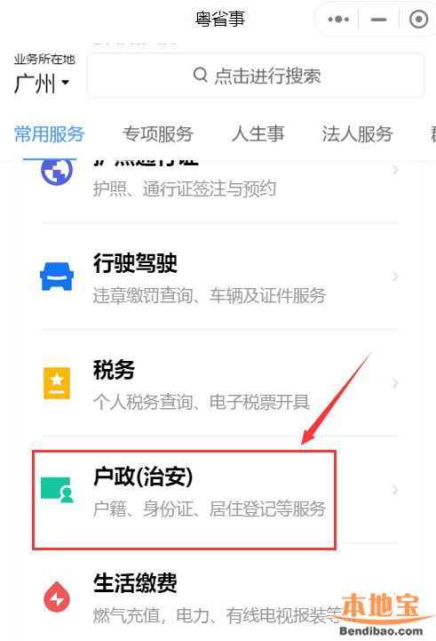 1、微信登录“粤省事”小程序,点击“服务”——“户政(治安)”。