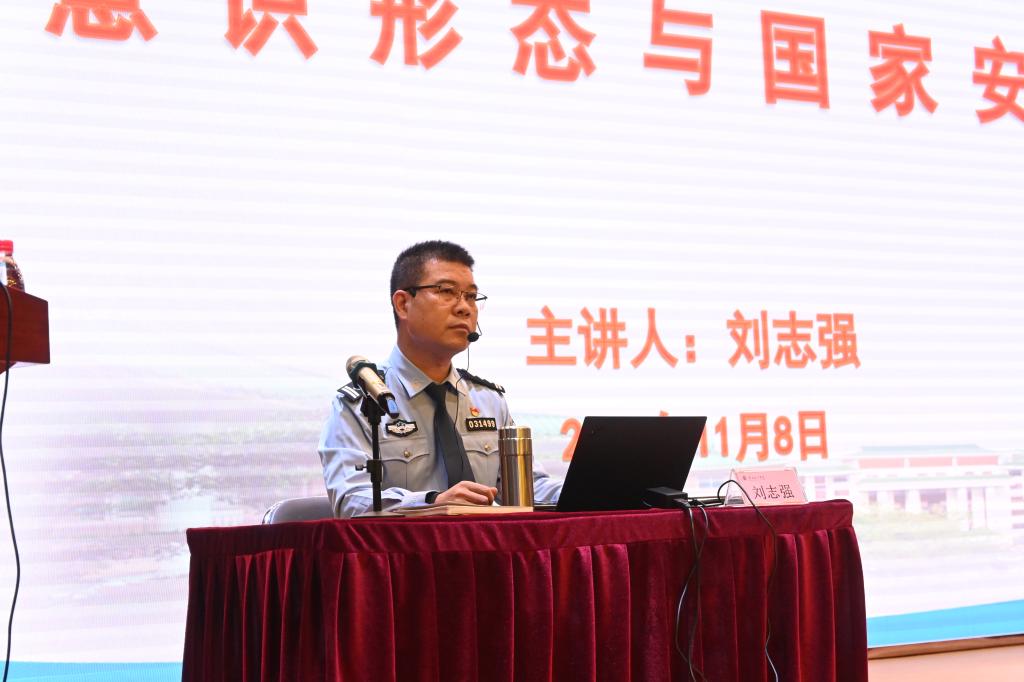 刘志强队长围绕《我们的路--意识形态与国家安全》主题,从习近平总书记关于意识形态的系列重要讲话和指示精神入手,围绕当前意识形态和国家安全所面临的挑战和如何应对展开了论述。刘队长从我们的意识形态、目前面临的风险和危险,我们的路等三个大方面深入浅出阐释了当前意识形态和国家安全工作的重要性。报告通过一系列详实的数据分析和典型案例解读,介绍了当前国家安全和社会政治稳定形势,阐述了国际综合实力变化情况,从国际关系入手深入解读了国家层面以及高校层面的社会稳定形势。