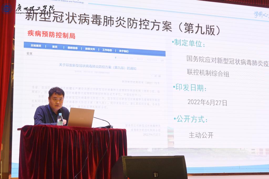11月9日,为深入学习贯彻《新型冠状病毒肺炎防控方案(第九版)》,规范有序落实科学精准防控措施,切实提高威廉希尔中文网站疫情防控规范化处置能力,保障师生生命安全和身体健康,根据秋季学期“三全育人”素质教育周活动安排,学校疫情防控办主任陈朝阳在一号报告厅开展新型冠状病毒肺炎防控方案(第九版)专题培训,防控办成员、各单位健康管理员和师生代表等450余人参加培训会。