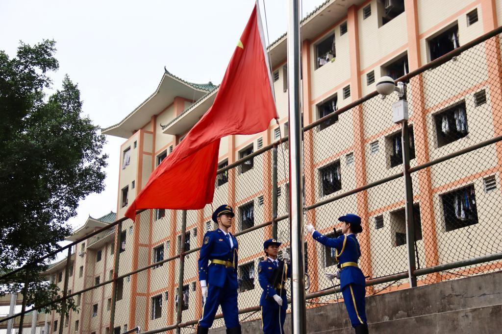 7时整,校国旗护卫队迈着整齐的步伐护送五星红旗走向旗杆,熠熠晨光中,奏《义勇军进行曲》,全体师生注视着五星红旗冉冉升起,肃立齐唱国歌。