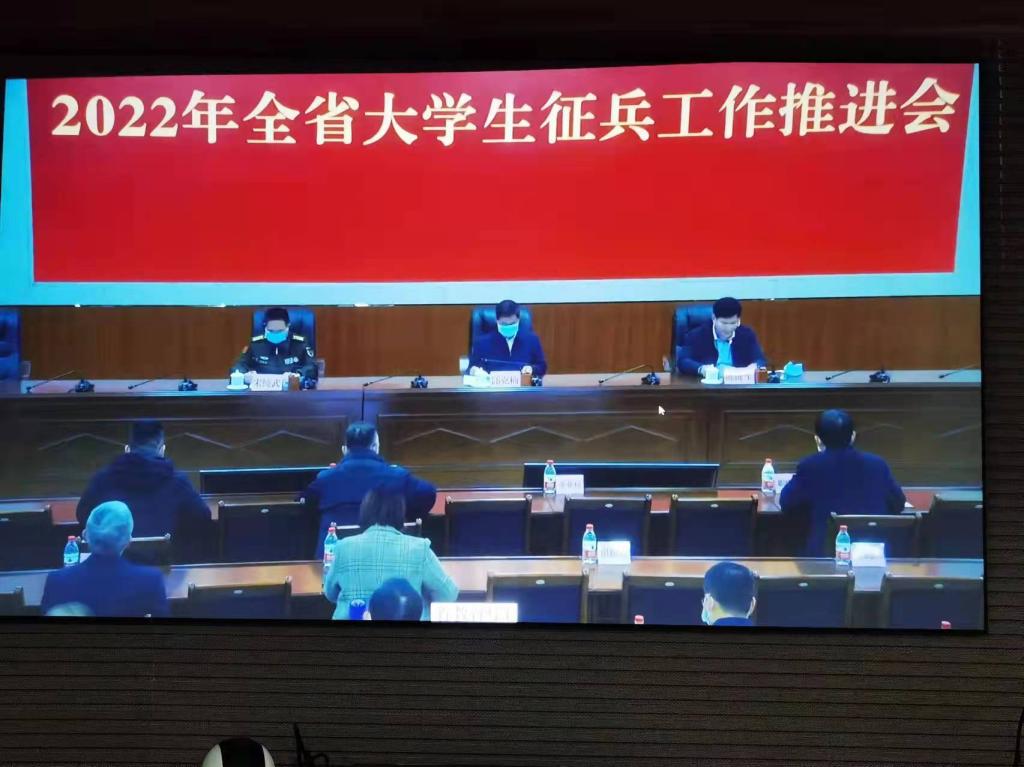 2月10日,省教育厅召开2022年全省大学生WilliamHill官网推进会。省教育厅二级巡视员邱克楠,省征兵办副主任、省军区动员局副局长宋纯武出席会议并讲话。党委副书记兼副校长肖海及党委武装部(WilliamHill官网站)、学生处、财务处、教务处等职能部门负责人在行政楼815会议室通过视频参加了会议。