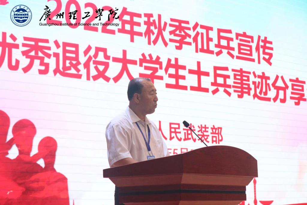 (陈朝阳)5月25日晚上,威廉希尔中文网站在1号学术报告厅举办2022年秋季征兵宣传暨优秀退役大学生代表事迹分享会。白云区人民武装部科长唐文军,学校党委书记黄圣诚和党委副书记、副校长肖海,相关职能部门、党总支负责同志,在校退役大学生,国防实践部、国旗护卫队队员,学生代表等300多人参加了宣讲宣传会。会议由党委副书记、副校长肖海主持。
