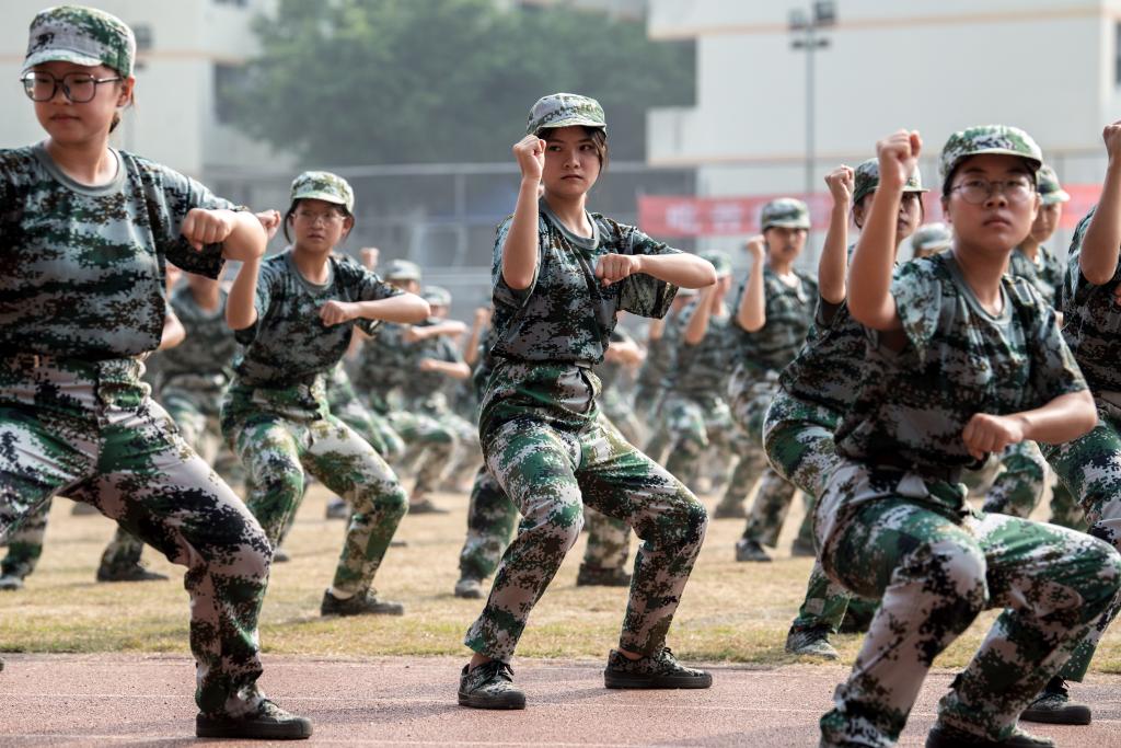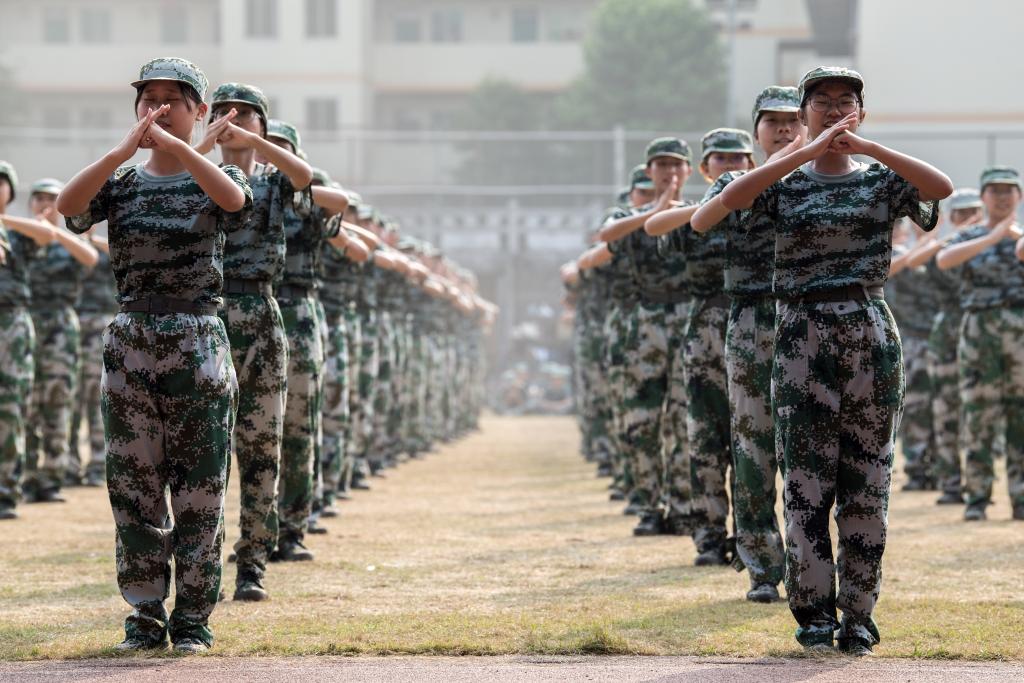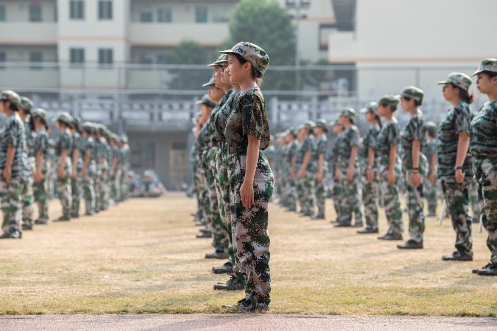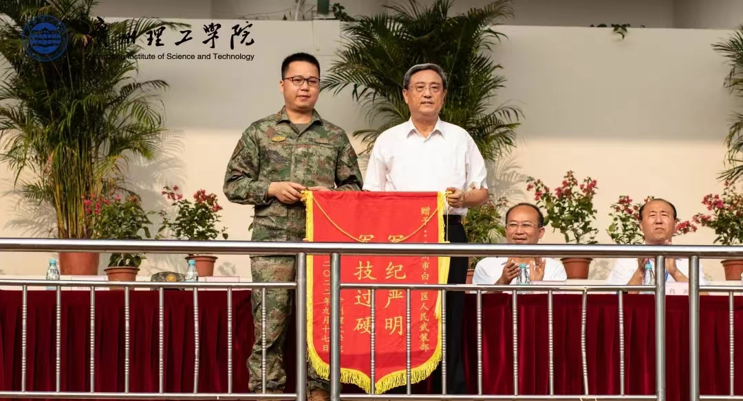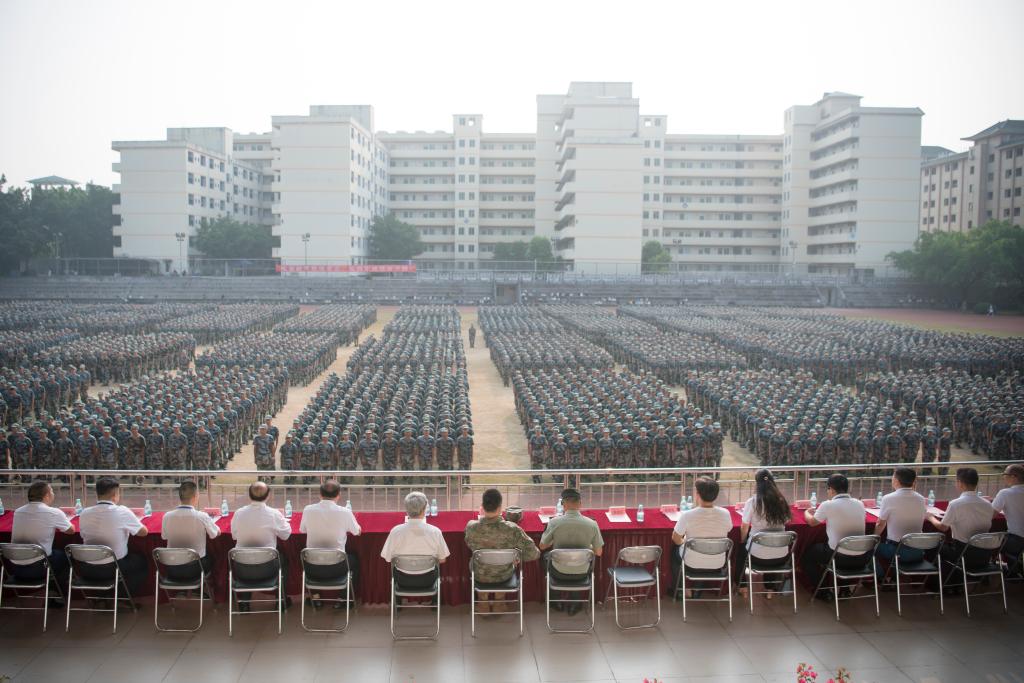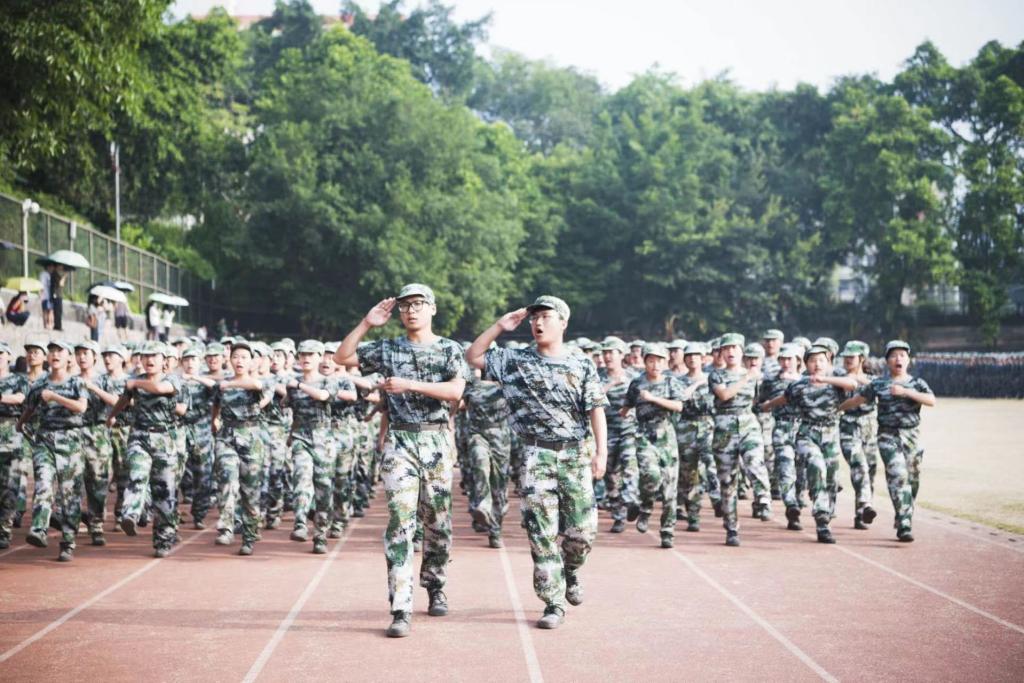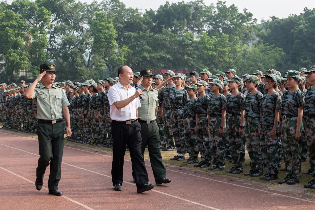 党委书记黄圣诚检阅受训队伍。各方阵齐装列阵、昂首挺胸,接受检阅。黄圣诚书记向全体学生致以亲切的问候:“同学们好!”“同学们辛苦了!”同学们报以“报效祖国”“为校争光”铿锵的青春誓言。
