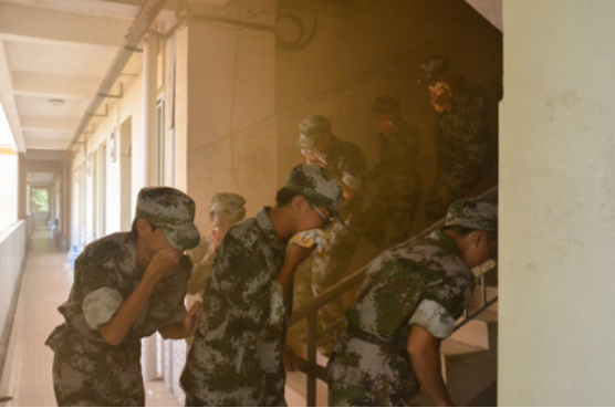 在随后的紧急疏散演练中,演习地点16栋B学生宿舍区预警信号响起,参加演练的学生在军训团教官的引导下用湿毛巾捂住口、鼻,从火警区楼道内紧急疏散,有序撤离至安全区。至上午11时,疏散演练任务圆满完成。